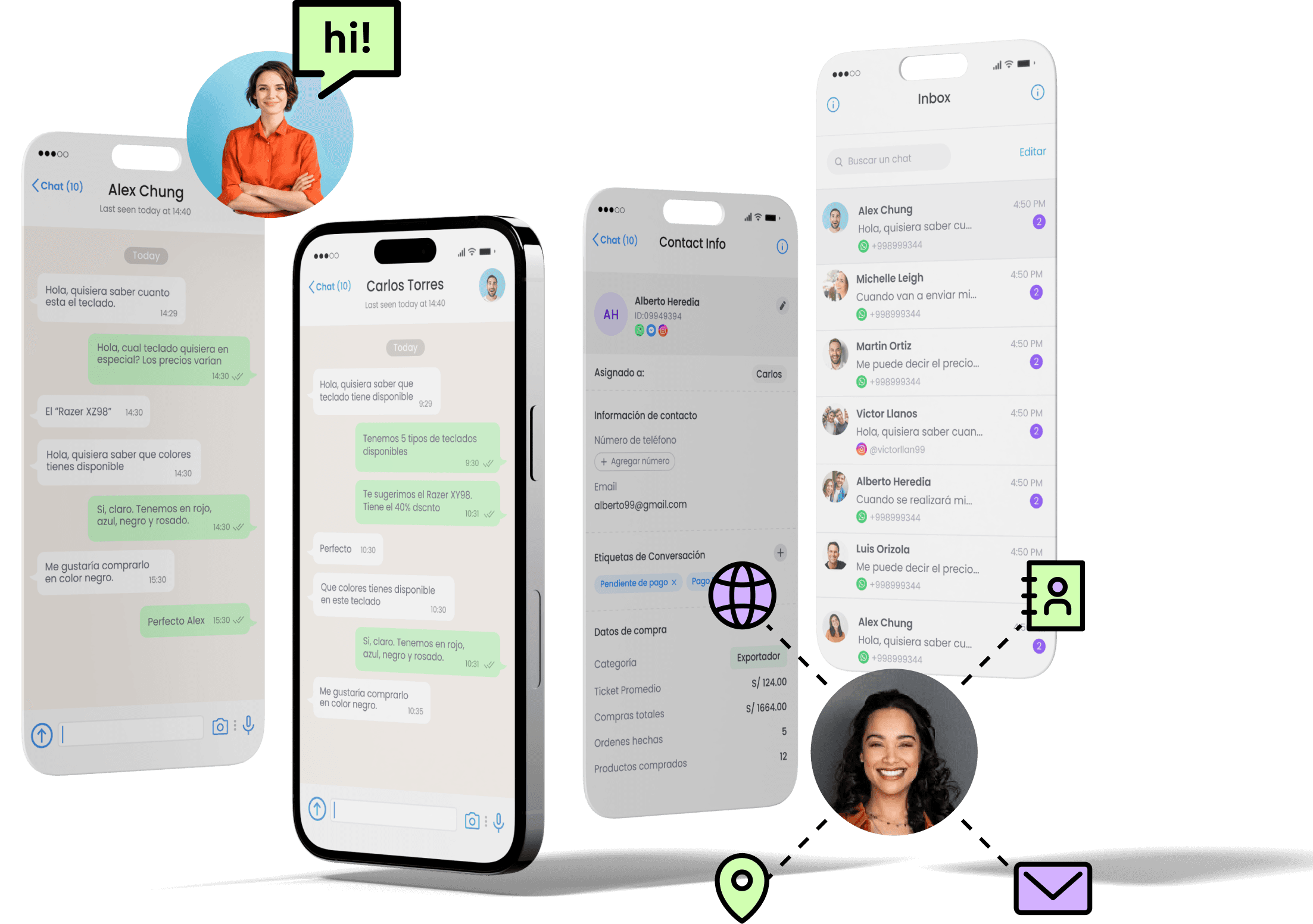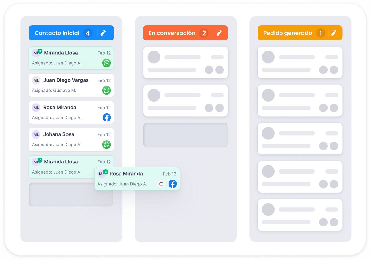 La herramienta que necesitabas para organizar tus chats de WhatsApp en un solo lugar. Te permitirá gestionar mejor a tus clientes y a tu equipo. Asigna encargados, crea etiquetas, revisa el historial de compra de tus clientes, programa mensajes, automatiza respuestas, y categoriza en embudos de venta tus conversaciones.