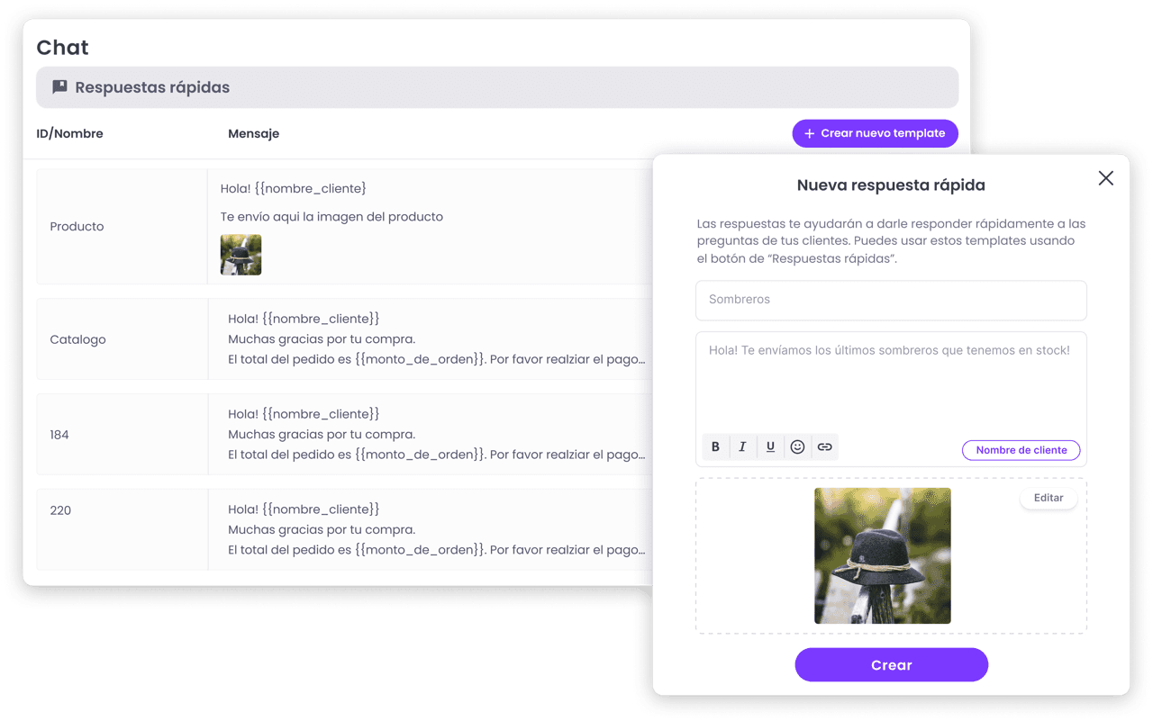 Responde instantáneamente con respuestas rápidas personalizables que incluyen imágenes, documentos y enlaces.