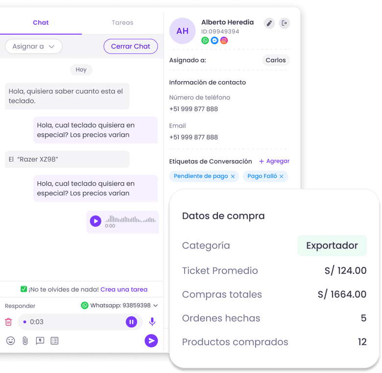 Ahorra tiempo con automatizaciones que gestionan respuestas y seguimientos de manera eficiente. Encuentra los datos de compra de tus clientes.